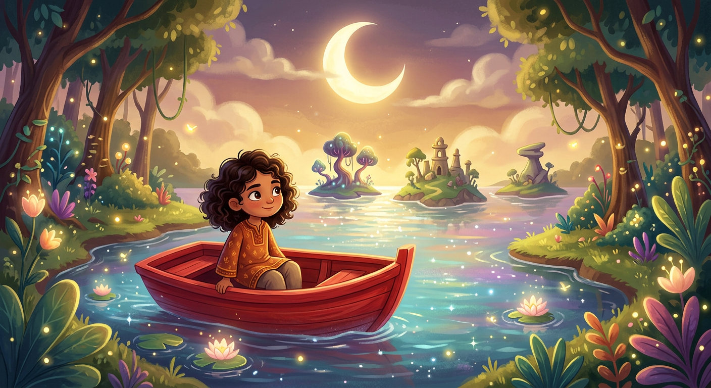 حين وجدت «سلمى» قارباً أحمر صغيراً يطفو على بحيرة الغابة المسحورة، لم تكن تعلم أنّ هذا القارب سيأخذها في رحلة عبر ثلاث جزر عجيبة، كلّ جزيرة تخبّئ لغزاً لا يُحلّ إلّا بقلب شجاع. هل ستجد سلمى طريق العودة قبل أن يغيب القمر؟